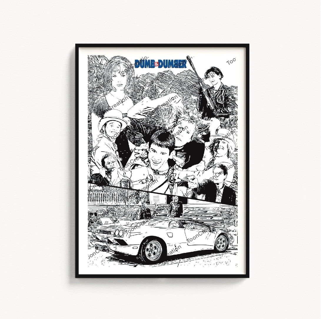 Nous retrouvons sur cette affiche, Jim Carrey, Jeff Daniels, Lauren Holly, Mike Starr, Karen Duffy & Charles Rocket accompagnés de la Lamborghini Diablo